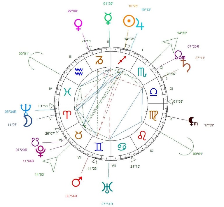 Il semble que cette fin de vie fatale digne d’un récit de tragédie grecque soit marquée par Pluton dominant dans le thème natal : les affres des tourments passionnels s’apaisent lorsque le cycle de la lunaison prend fin et que Pluton reprend sa course directe à 47 ans, la rétribution karmique cesse.. le résultat de l’expérience de transformation plutonienne s’incarnera lors du prochain cycle.